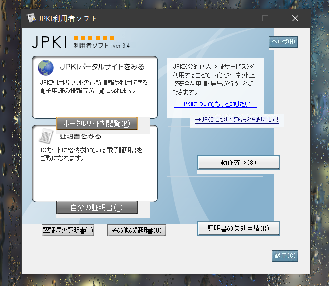 | ⑤ JPKI 이용자 프로그램 | 利用者クライアントソフトのダウンロード | 公的個人認証サービス ポータルサイト (jpki.go.jp) 다은로드 링크 Windows 또는 Mac자기 운영체재 확인 후 다운르도 해주세요 |
