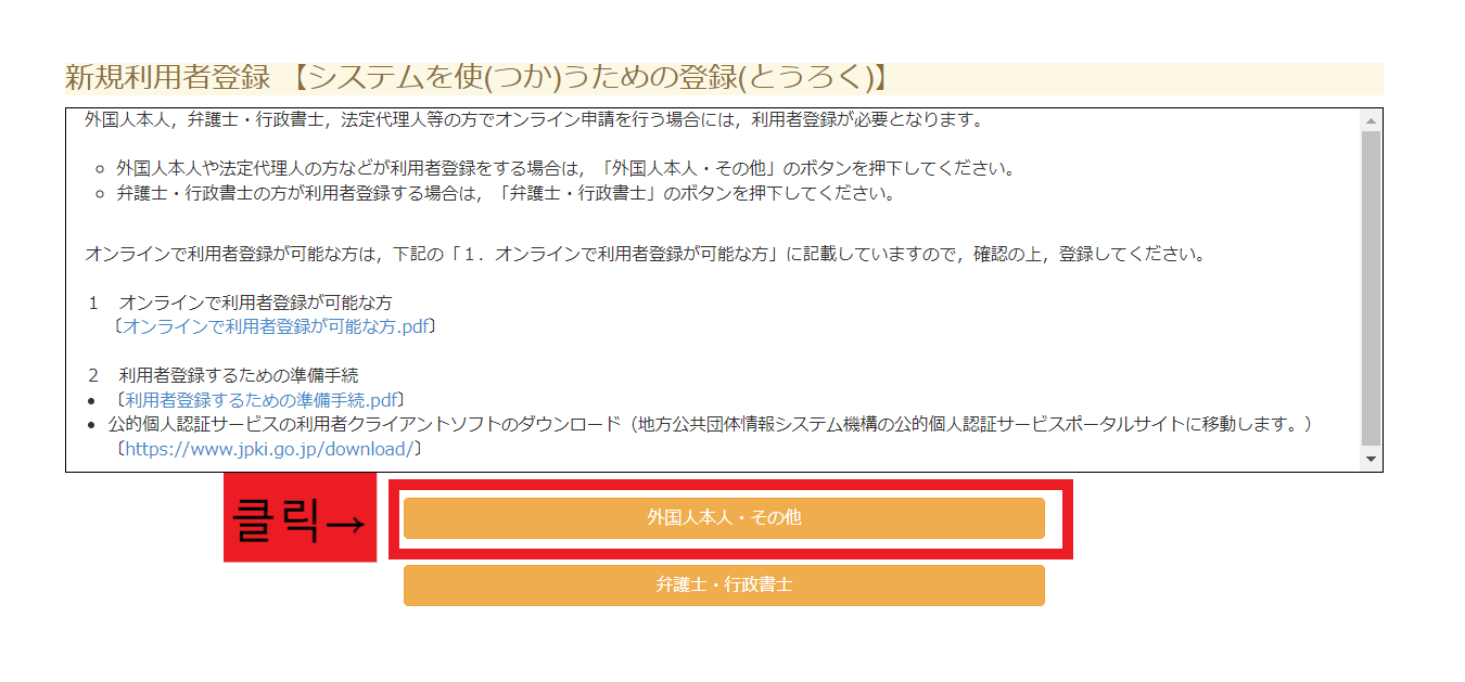 | 2. 신규이용자등록 사이트에 접속 후 '외국인 본인·기타'를 클릭합니다. |